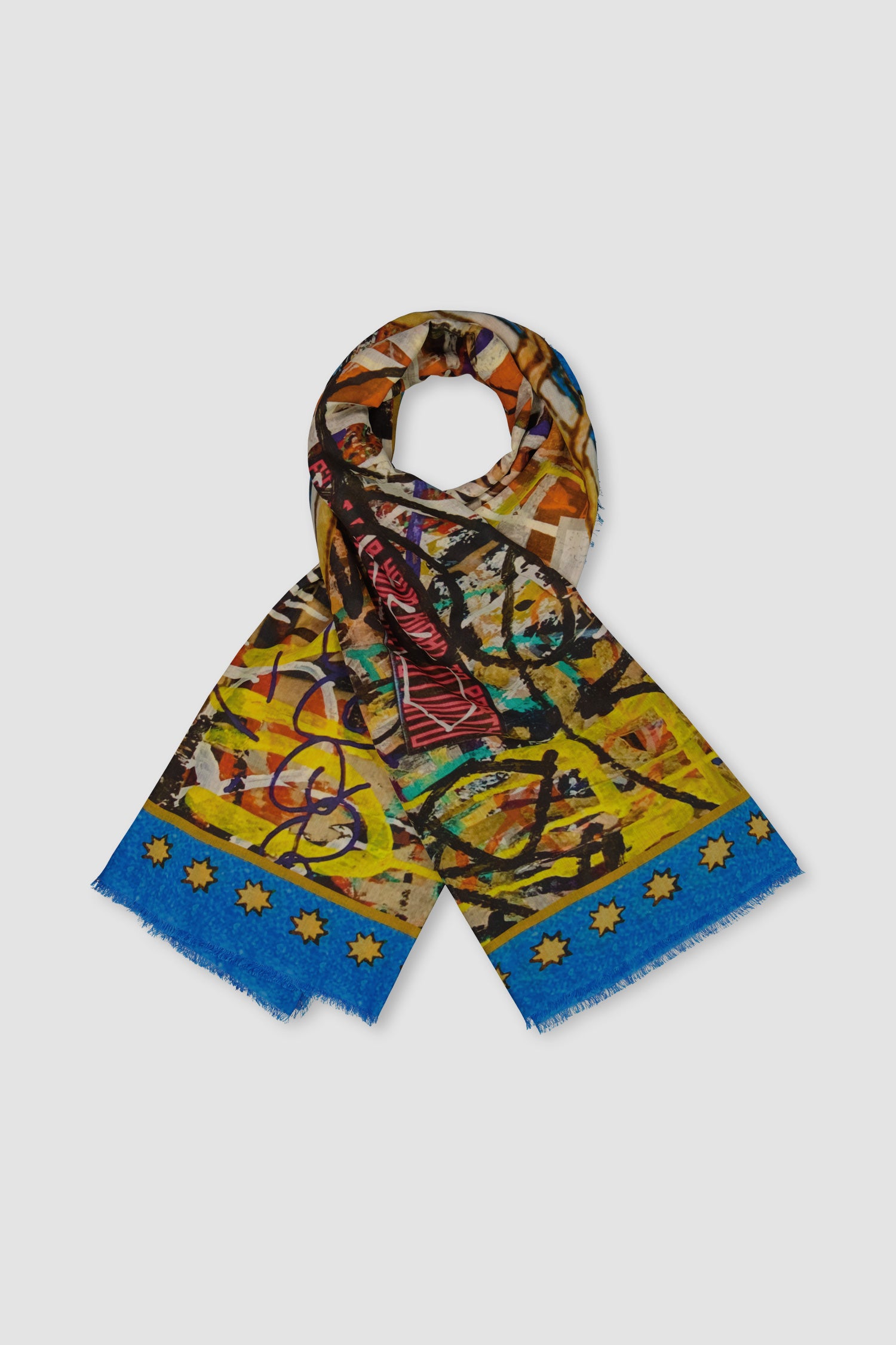 'Without Filter', a product of the creative partnership between Faliero Sart and Coreterno, a lifestyle brand influenced by the captivating realm of overlooked rebellious poets and ancient engravers. Crafted from modal cotton and cashmere blend, this scarf showcases an eclectic multicolor print, making it a bold and distinctive addition to your seasonal outfits.